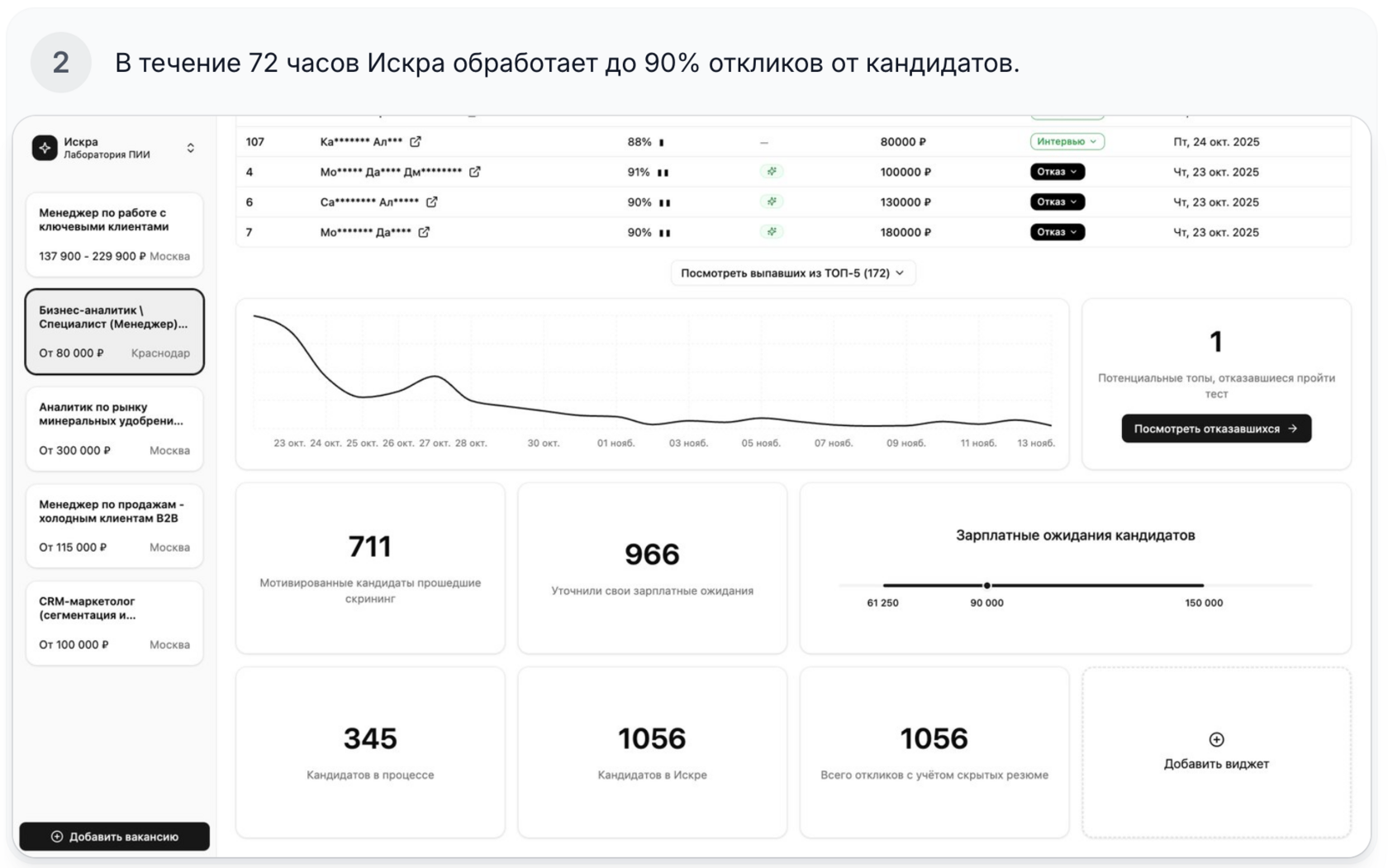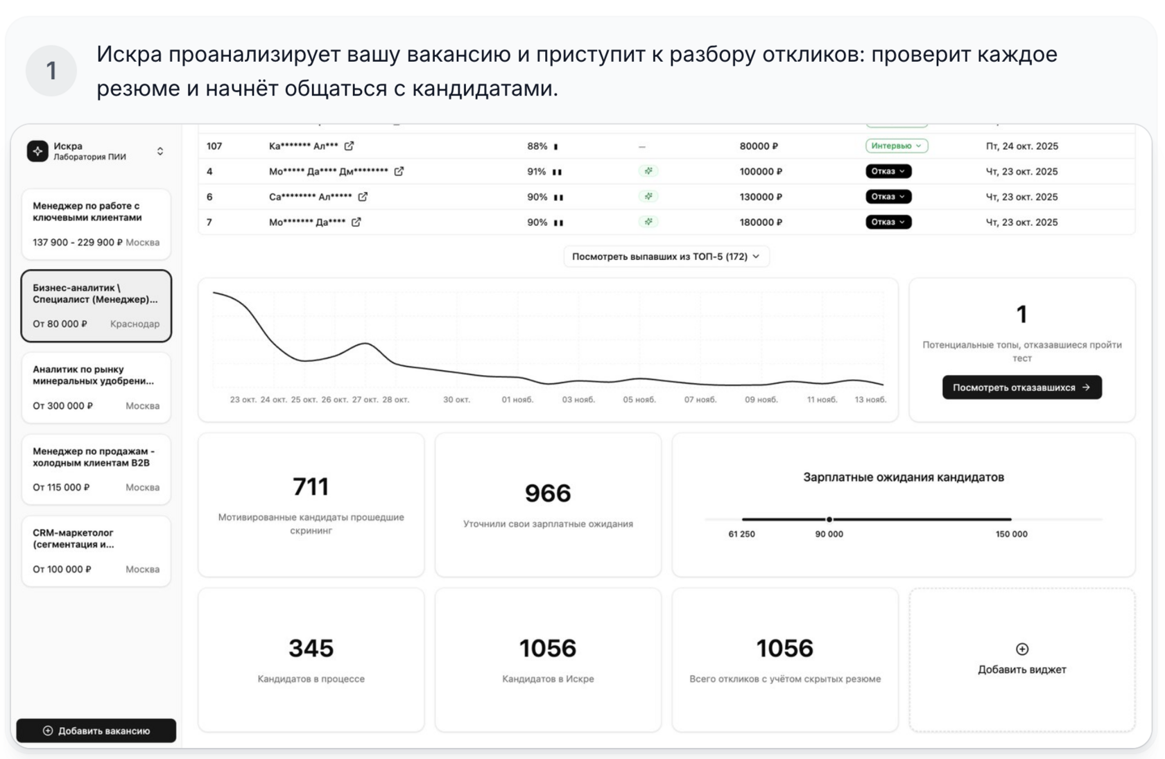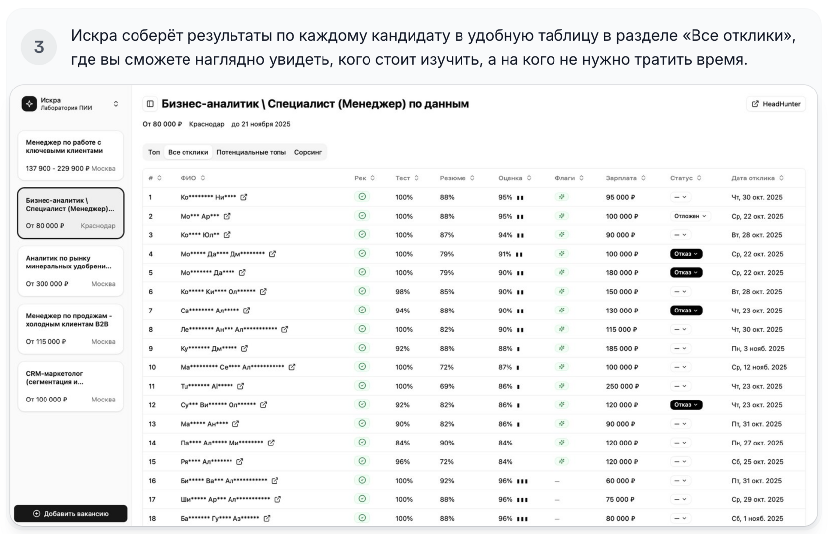 Инструкция показывает, как Искра берёт рутину на себя: анализирует вакансию, обрабатывает отклики, оценивает кандидатов и формирует готовый список ТОП-5, чтобы вы тратили время только на лучших.