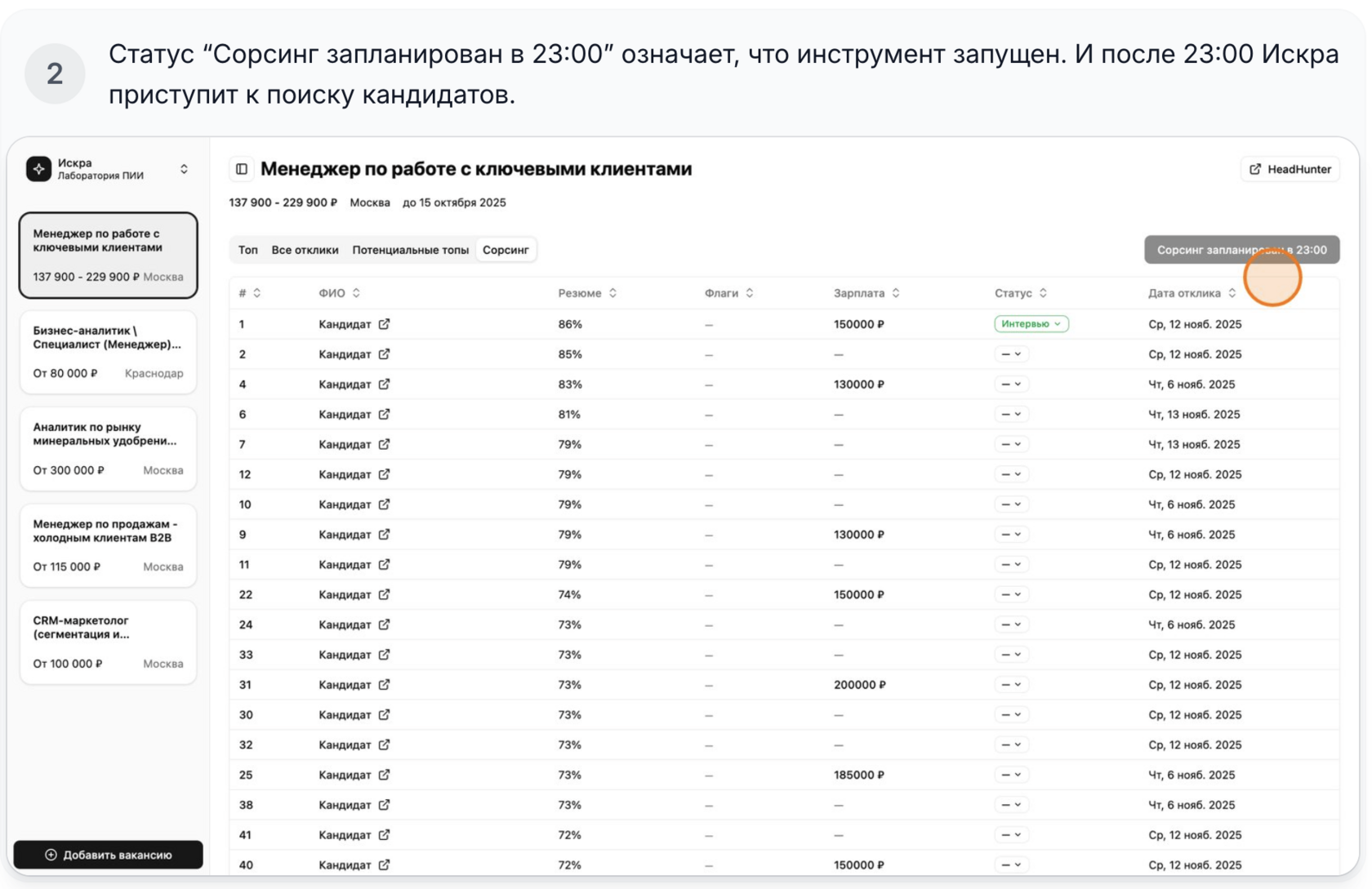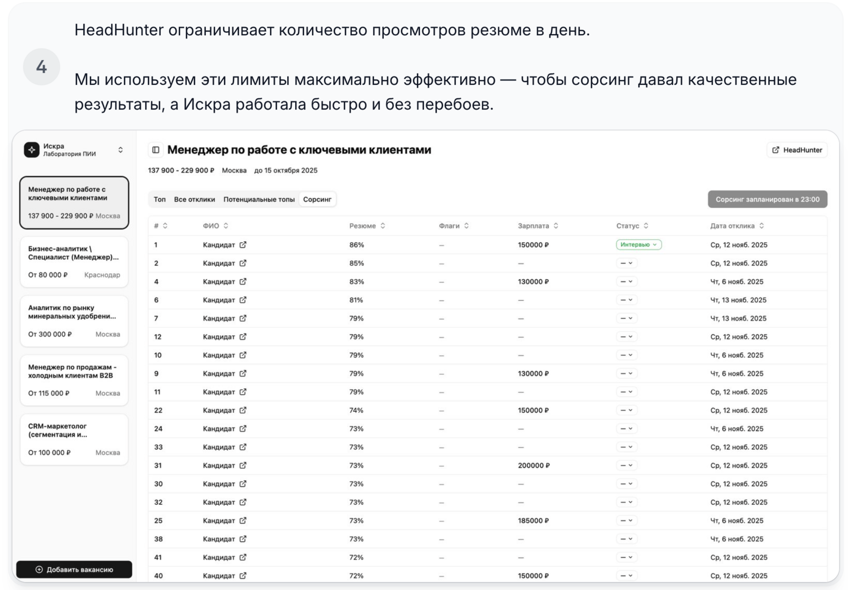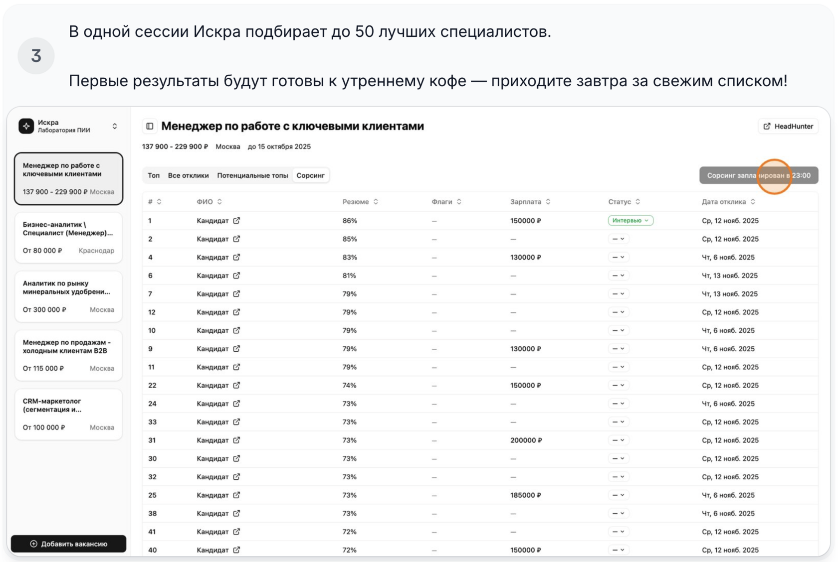 Инструкция о том, сколько времени нужно Искре, чтобы выдать кандидатов через сорсинг: когда стартует поиск и когда появятся первые результаты.