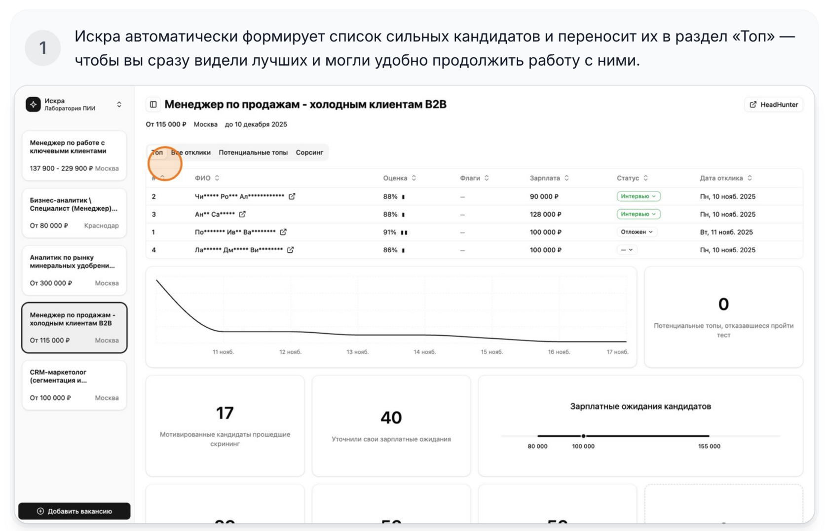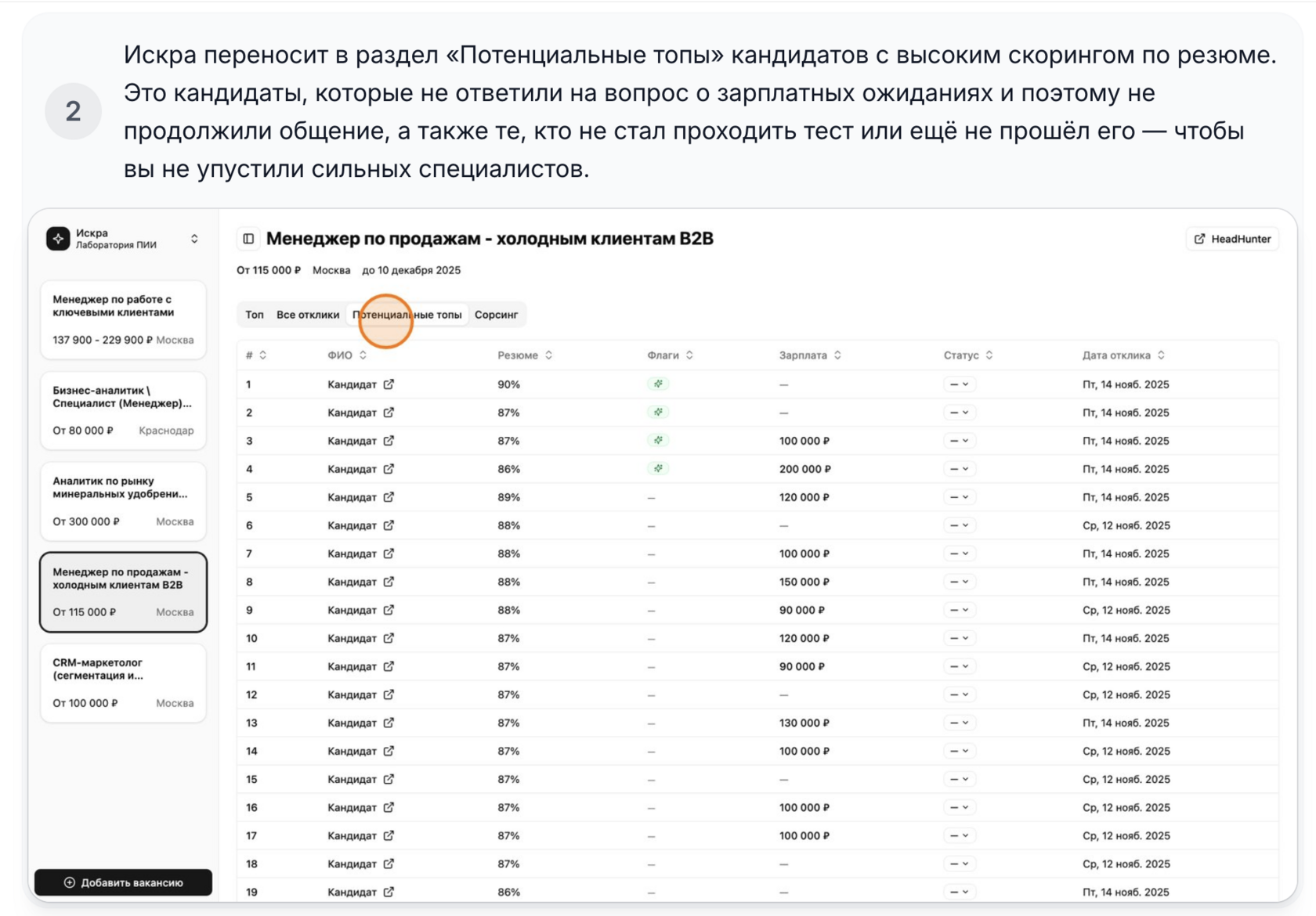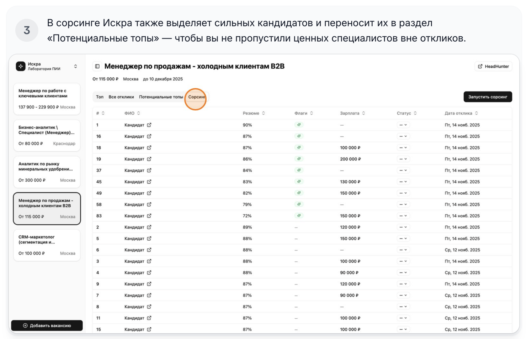 Инструкция показывает, как Искра помогает не пропустить сильных кандидатов: автоматически формирует список сильных кандидатов, выделяет перспективных по резюме и поднимает ценных специалистов из сорсинга — чтобы лучшие всегда были у вас в фокусе.