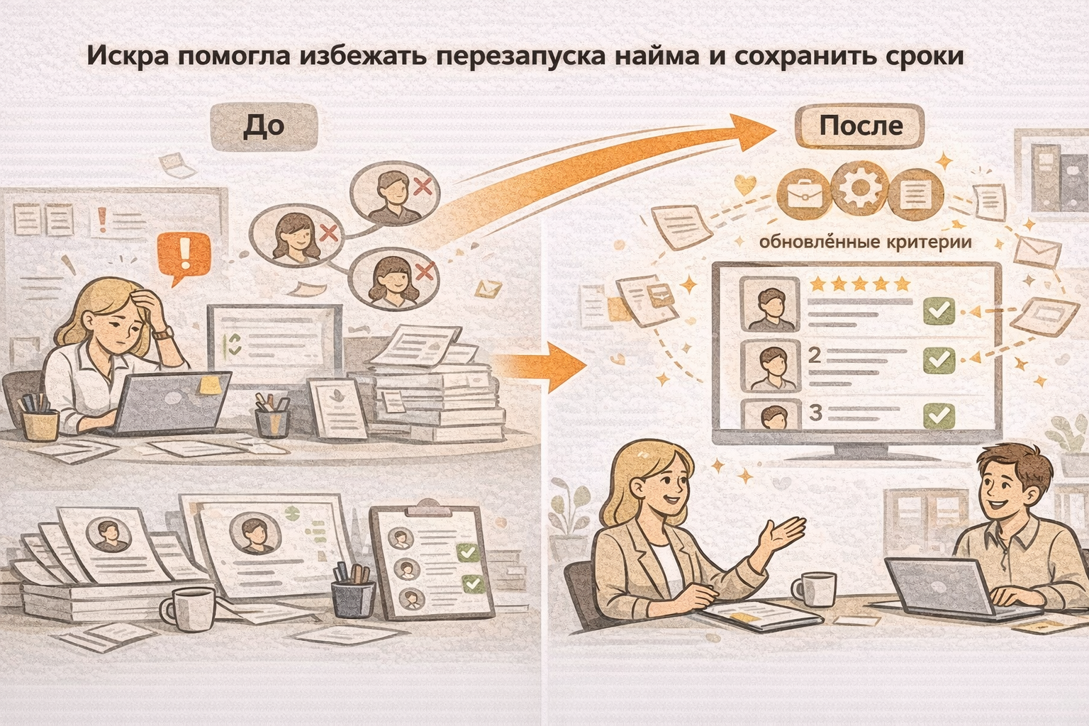 "Искра" позволяет быстро учитывать изменения требований без перезапуска найма, находя подходящих кандидатов в уже обработанном пуле.